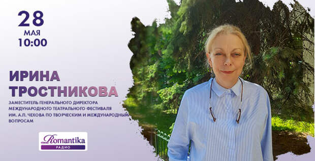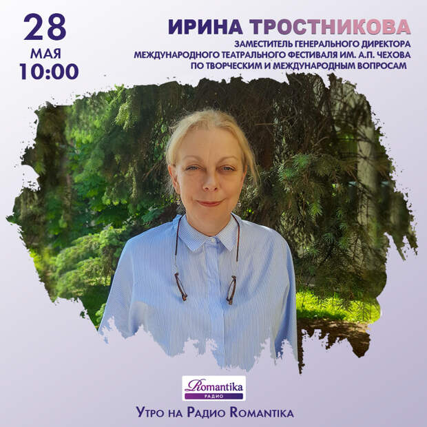 28 мая в 10:00 в гости к утреннему шоу на Радио Romantika придёт Ирина тростникова – заместитель генерального директора международного театрального фестиваля А.П.Чехова по творческим и международным вопросам.