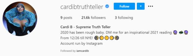 Пиши мне в директ, чтобы получить вдохновляющее предсказание на 2021 год», — сообщила Карди Би.