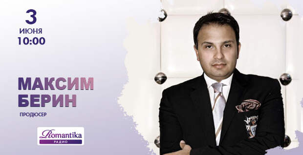 3 июня в 10:00 в гости к утреннему шоу на Радио Romantika придёт продюсер, глава концертного агентства Berin Art Management Holding Максим Берин.