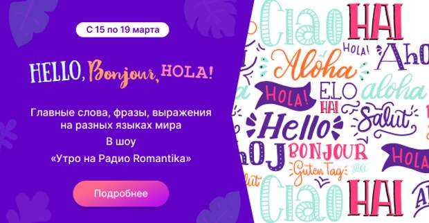 Необходимый набор фраз для путешествия, общения и знакомства с 15 по 19 марта в шоу «Утро на Радио Romantika». Носители языка поделятся популярными иностранными словами и выражениями!