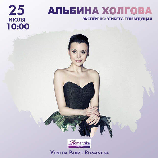 25 июля в 10:00 в гости к утреннему шоу на Радио Romantika придёт эксперт по этикету и телеведущая Альбина Холгова.