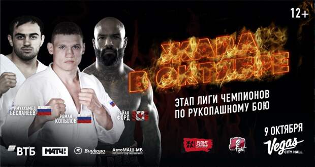 На этот раз на ковре за громкие титулы сразятся лучшие бойцы лиги чемпионов по рукопашному бою, а команда «ЖАРА Fight» снова подарит настоящим ценителем профессиональных единоборств уникальное шоу в спортивно-развлекательном формате.Профессиональную команду в 6 бескомпромиссных поединках этапа Лиги чемпионов по рукопашному бою «ЖАРА В ОКТЯБРЕ» представят лучшие бойцы и титулованные чемпионы из разных стран: Александр Зайцев, Ярослав Абрамов, Александр Солдаткин, Магомед Абдурахимов, Максим Ефременко, Рахметулла Сатывалдиев, Юрий Круглов. Также гостей ждет особое зрелище – жаркий поединок в женском дивизионе. Российская чемпионка Алексеева Ирина проведет бой за специальный титул и приз против титулованной и опасной соперницы - Замзагуль Файзоллановой из Казахстана. Кульминацией бойцовского шоу станет громкий международный титульный бой чемпиона мира и Европы непобежденного нокаутера Нурмухаммеда Бесланеева против канадца Райана Форда, который успешно выступает одновременно в боях по боксу и ММА, в том числе побеждал в чемпионатах WSOF и Bellator.