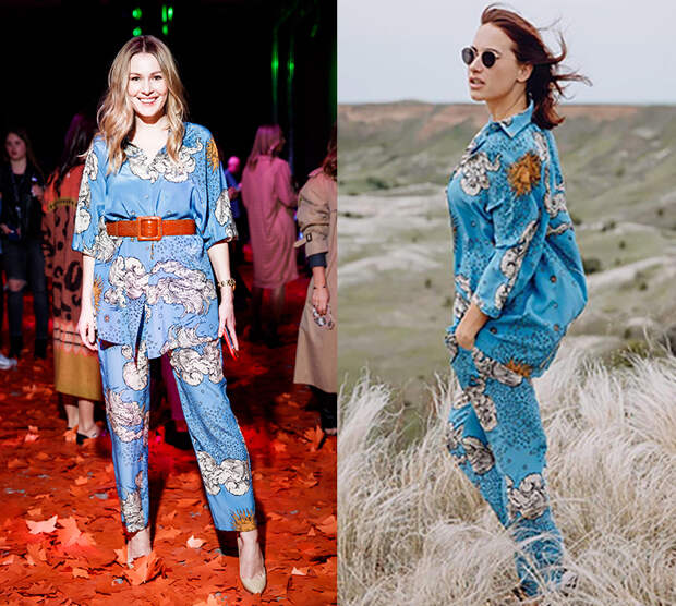 Российская актриса Мария Кожевникова посетила модный показ в костюме в пижамном стиле от Алены Ахмадулиной. Она дополнила его красно-коричневым поясом и нюдовыми туфлями. Этот же нежно-голубой костюм с принтом в виде солнца и облаков решила примерить телеведущая и актриса Мария Кравцова.