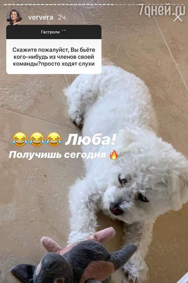 В качестве ответа артистка разместила в Instagram stories забавную фотографию, где пушистый пёсик трепет игрушку, подписав публикацию: «Люба, получишь сегодня!»Люба — постоянный член команды Брежневой, девушка отвечает за макияж и укладку звезды на различных мероприятиях. С помощью шутливой картинки Вера хотела сообщить, что по отношению к своим сотрудникам никакого рукоприкладства никогда себе не позволяла, и это лишь домыслы недоброжелателей.