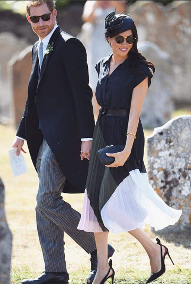 На торжестве Меган появилась в тёмно-синей платье и шляпке бренда Philip Treacy. Образ дополнили изящные черные лодочки и черный клатч.