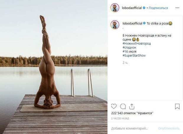 Певица добавила, что планирует повторить этот трюк на следующем концерте, который состоится 16 июля в Нижнем Новгороде. Девушка получила множество лестных комментариев к откровенному снимку, но позже подписчики узнали, что опубликованное фото принадлежит американской модели, известной под псевдонимом Nude Yoga Girl. Интересно, что спустя некоторое время публикацию Светлана удалила.