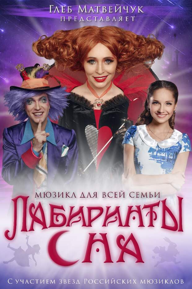 Глеб Матвейчук к Новому году приготовил для взрослых и детей волшебный подарок – мюзикл нового поколения «Лабиринты сна».Оригинальная фантазия по мотивам сказки Льюиса Кэрролла «Алиса в стране чудес» с участием Анастасии Спиридоновой («Голос», «Три аккорда»), Алексея Боброва («Красавица и Чудовище», «MAMMA MIA», «Звуки музыки»), Андрея Бирина («Привидение», «Анна Каренина», «Бал вампиров»),Марии Иващенко(«Территория страсти», «Признание», «Алые паруса», телесериал «Молодёжка») и других звезд российских мюзиклов!