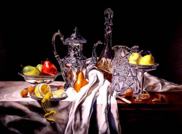 Хрустальные кувшины и серебряные блюда на белоснежных салфетках, контрастирующих с темным фоном и яркими деталями в виде фруктов или цветов, образуют безупречный натюрморт, который может украсить любой интерьер. Но, чтобы создать его, нужно здорово потрудиться. Самое сложное — не запутаться в тенях и визуальных эффектах прозрачного хрусталя, попутно работая над глубоким черным фоном.